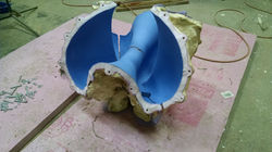![]() Urethane molding. | ![]() Pattern bedding prior to molding. | ![]() Finished rubber mold with wax casting. |
