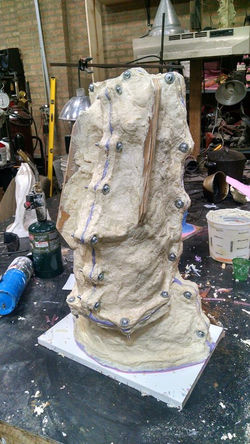 ![]() Pattern durring preparation for rubber molding. | ![]() Finished mold with wax casting. | ![]() Pattern, mold, and wax casting. |