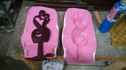 ![]() Rubber mold with mother mold in progress. | ![]() Open rubber mold with mother mold. | ![]() Rubber mold in process with pattern. |